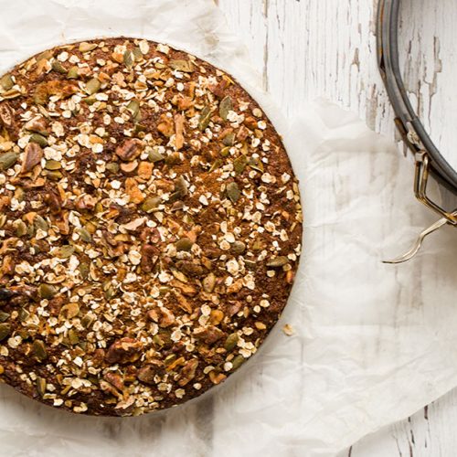 Coloque numa forma de abrir (com 20cm de diâmetro), previamente forrada com papel vegetal, e alise o topo com as costas de uma colher.