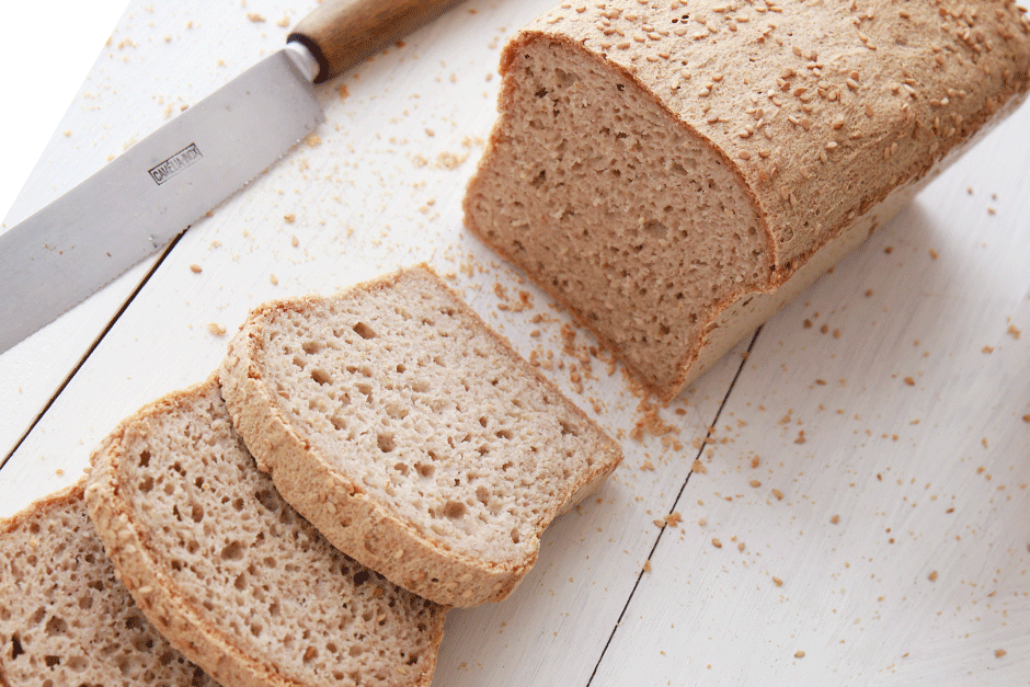 * Se usar o fermento fresco, junte-o à água no ponto 2, adicionando 1 colher de chá de farinha de arroz integral. Deixe ativar durante 10 minutos e, só depois, junte o azeite e o ovo.** Psyllium husk é a casca da semente do psílio. É uma fibra natural solúvel que quando misturada com a água se transforma numa goma com uma consistência muito parecida com a do glúten. Nesta receita este ingrediente é fundamental pois vai dar elasticidade à massa e garantir que o pão não esfarele. Não deverá ser substituído pelas sementes inteiras de psílio.