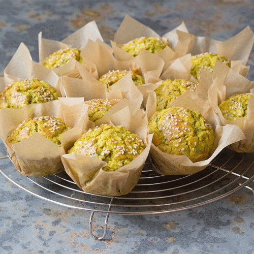 Coloque a massa num tabuleiro de queques previamente untado e/ou forrado com papel vegetal e, por cima, salpique com sementes, orégãos ou queijo Emmental em fios.