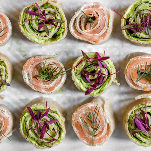 Enrole os crepes e guarde-os no frigorífico até à hora de servir. Antes de servir corte os rolos em fatias grossas e decore com rebentes e/ou ervas frescas.
