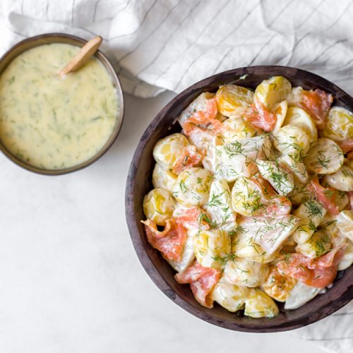 Para finalizar a salada, coloque numa taça grande as batatas, o salmão previamente cortado em pedaços e metade da maionese. Misture bem e, no fim, decore com o endro picado. Sirva o que sobrou da maionese numa taça à parte.