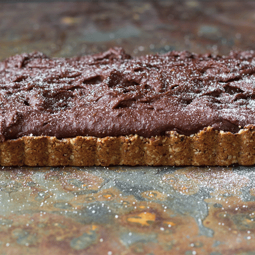 Entretanto, sem lavar o copo, prepare o recheio. Parta a tablete em pedacinhos batendo com a embalagem ainda fechada na bancada e, de seguida, coloque no processador. Triture até obter uma farinha de chocolate fina.